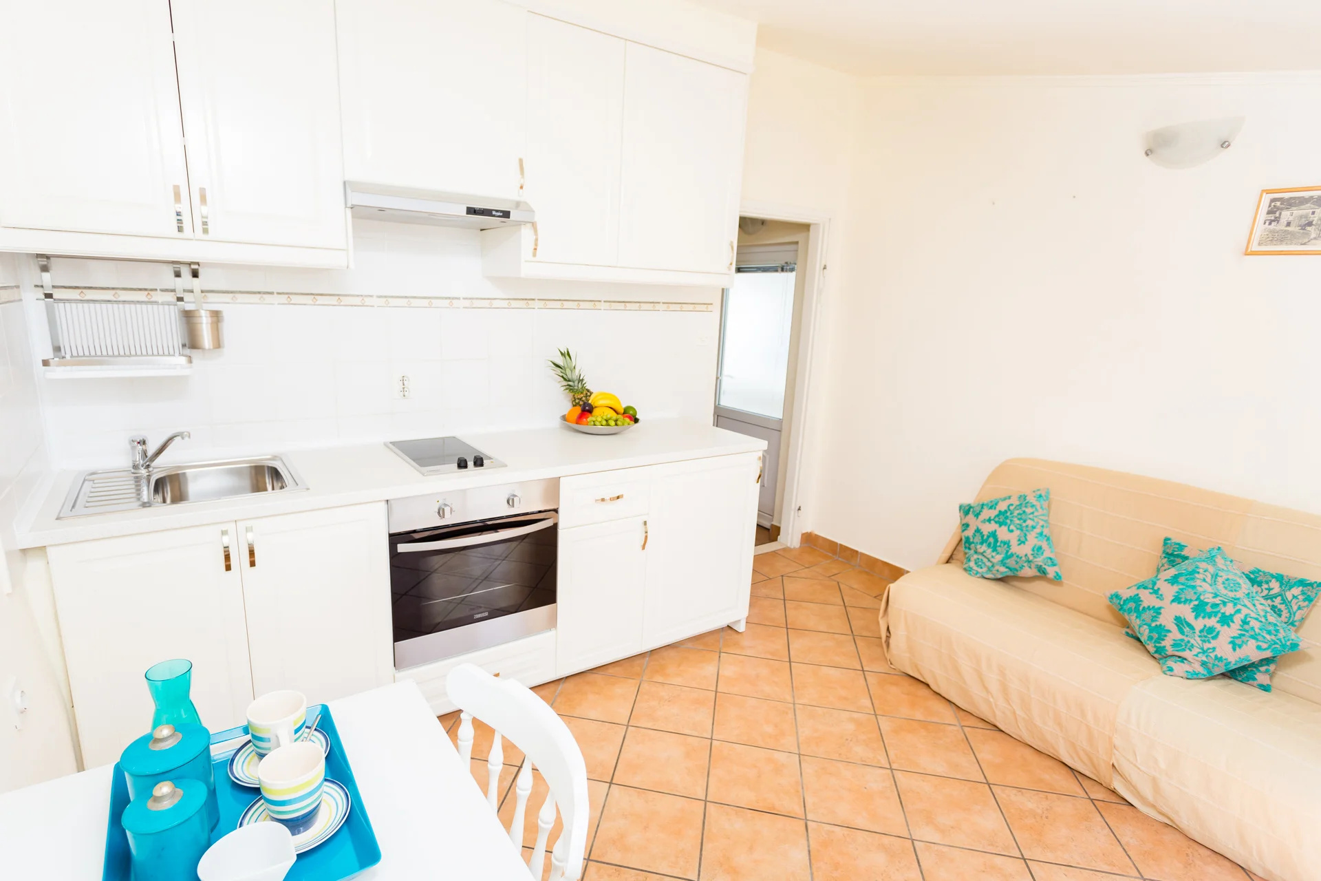 Our newly renovated waterfront apartments each have a private balcony with 180 degree water views and a retractable canopy for shade. Here you can sunbathe, or enjoy dinner under the stars. The apartments have Wifi, A/C and flatscreen satellite TVs. Our apartments are self catering with fully equipped kitchens and a barbecue area. We do not serve breakfast. The en suite bathrooms each have a shower and hair dryer. Each bedroom has a double bed, linen and there is an extra fold out sofa bed in the living room/kitchen. Our 1 bedroom waterfront apartment sleeps up to 3 people, while our 2 bedroom 2 bathroom waterfront apartment sleeps up to 5 people.